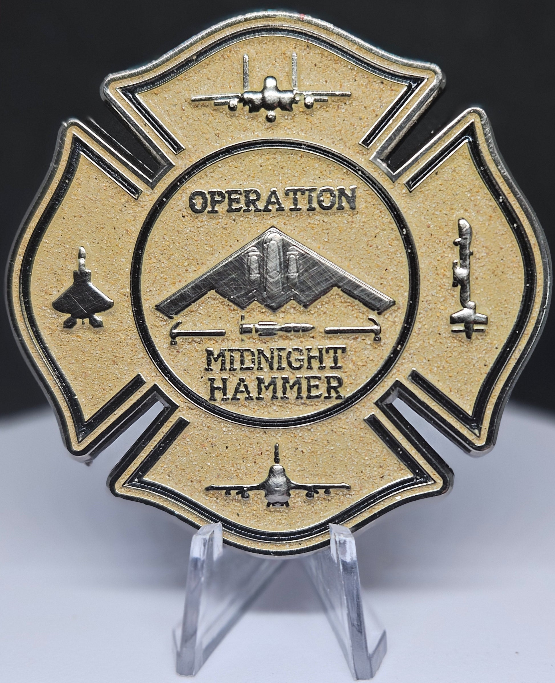 Amazing 2.5" from the 332nd AEW Redtails. Front has a traditional 3D logo celebrating the historic lineage of the Wing. While the back focus on the historic support of OPERATION MIDNIGHT HAMMER. The back has actual sand covering the coin.