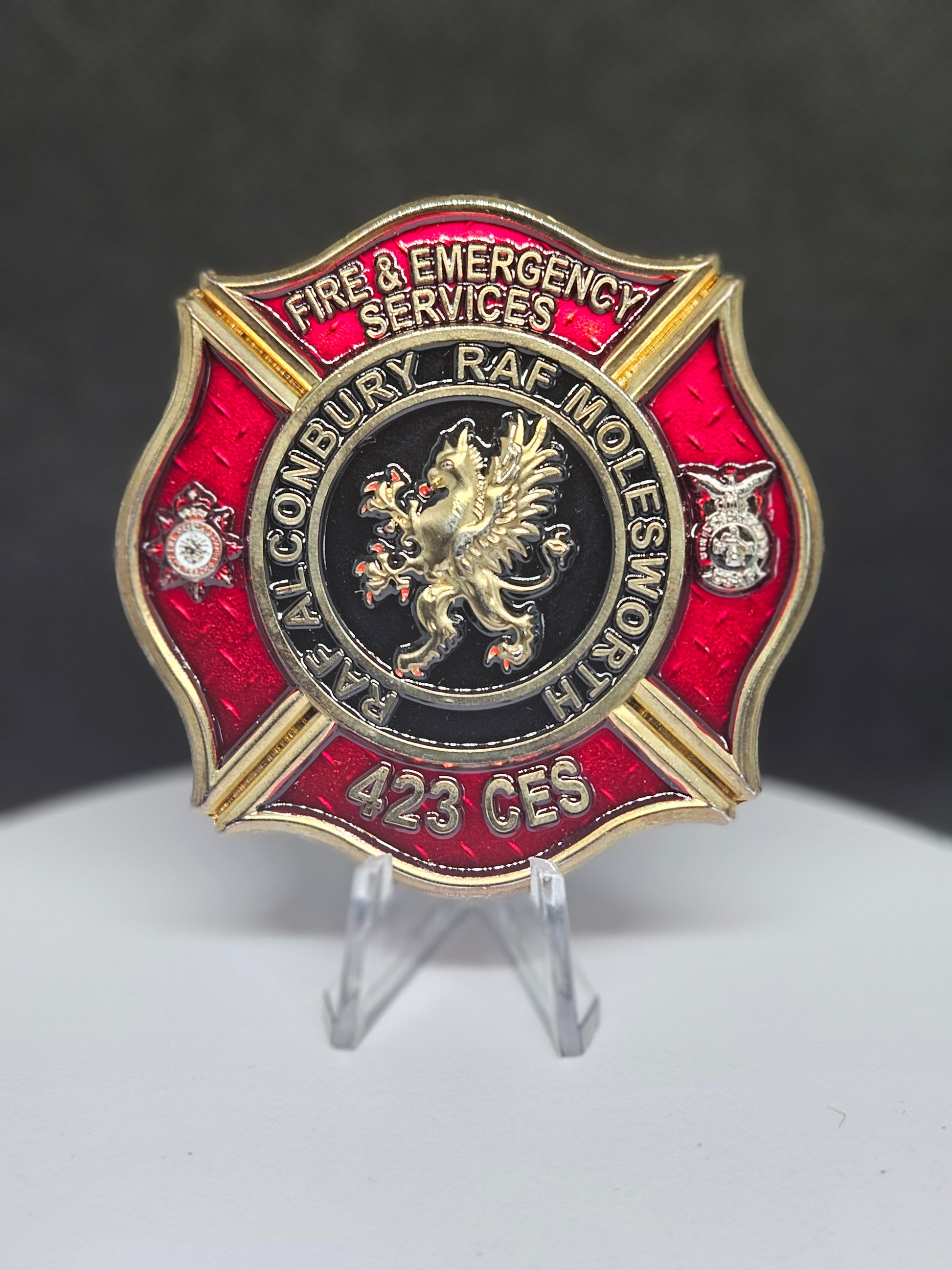 2.5" Maltese coin with red translucent diamond plate with a Griffin in the middle. The back side has the unit symbols from both the USAF and RAF.